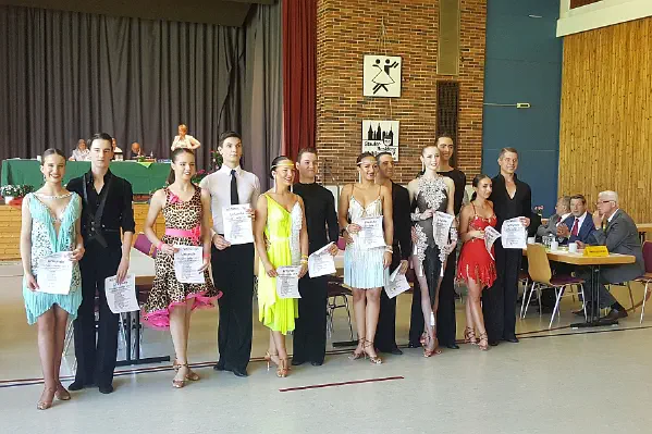 Gleich früh am Morgen haben sich Jan Sommer und Laura Zezelj für ihr Turnier in der HGR C Latein fertig gemacht und sind gut gelaunt und bestens vorbereitet an den Start ihres erst fünften gemeinsamen Turnieres gegangen. Schon in der Vorrunde konnten die beiden die Wertungsrichter von sich überzeugen. Sie schafften es am Ende von 13 gestarteten Paaren in das Finale der besten 6 Paare und erreichten den 1. Platz mit allen gewonnen Tänzen (Samba, ChaChaCha, Rumba und Jive). Ganz tolle Leistung!
