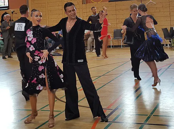 Dabei gingen Carolin Sommer-Trembo und Elazar Fayzulaev in der Hautgruppe A Latein mit weiteren 6 Paaren an den Start. Die beiden hatten sich sehr viel vorgenommen und konnten die Wertungsrichter durch harmonisches Tanzen von sich überzeugen. Dabei half auch die Unterstützung der clubeigenen Fans und sie schlossen das Turnier mit einem sehr guten 2. Platz ab. Das bedeutete, dass Carolin und Eli noch alle Chancen zum Gewinn der „TBW-Trophy-Serie“ hatten, denn sie standen vor dem Finaltag (Sonntag) an der Spitze des Feldes in der Hauptgruppe A-Latein.