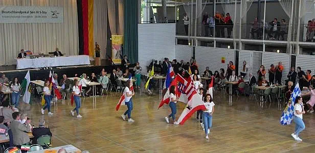 Nach der Vorrunde begann die eigentliche Eröffnungszeremonie. 15 jugendliche Tänzerinnen und ein Tänzer präsentierten in einer Fahnenparade die 16 Bundesländer.