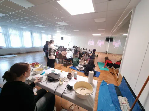 Von 14 bis 17 Uhr fand das Dance-Styles-Winterfest statt. Bei leckeren Waffeln, Kakao und Kaffee sowie anderen kleinen Naschereien saßen Tänzerinnen, Trainerinnen und Eltern gemütlich zusammen und ließen das vergangene Tanzjahr Revue passieren. Ab etwa 15 Uhr wurden die Tänze der Vergangenheit dann auch visualisiert: Mit Hilfe eines Beamers projizierten die Trainerinnen alte Show-Aufnahmen aus der Stadthalle auf die weiße Trennwand des Saals und weckten damit wunderschöne Erinnerungen.